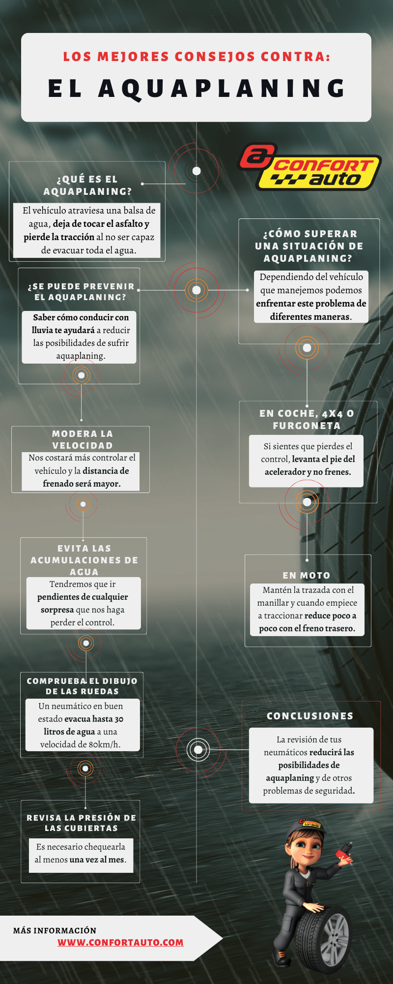 Desde Confortauto siempre queremos darte los mejores consejos de seguridad en carretera y uno de los eventos más frecuentes en esta época del año, así como en primavera, es el aquaplaning. Este suceso pone a prueba nuestra destreza y templanza como conductores así que hoy queremos darte algunos consejos al respecto.