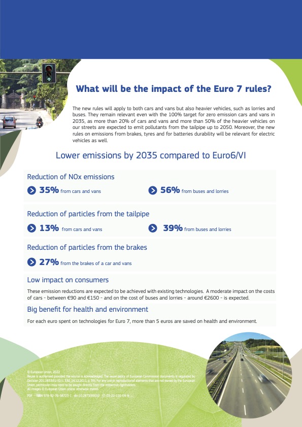 De este modo, la Euro 7 estima reducir este nivel de contaminación en un 13% para turismos y furgonetas y un 39% para vehículos pesados. Establece, además, que continuará revisando los máximos permitidos de los neumáticos y frenos, aún después del año 2035. Según sus estimaciones, los automóviles de combustión interna supondrán un 20% del total de vehículos en circulación, puesto que se prohibirá su fabricación, pero no su uso.