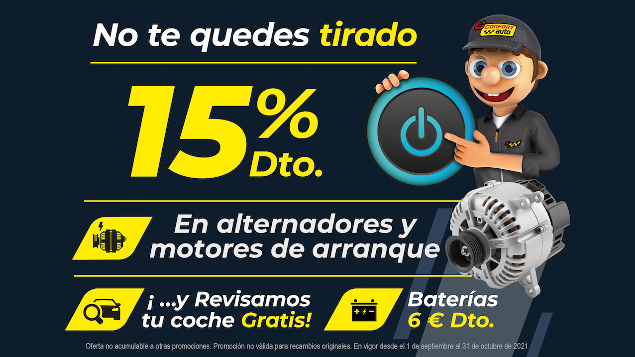 Con la llegada del frío, el sistema eléctrico del coche puede sufrir fallos por agotamiento o descargas. De hecho, suele ser una de las principales causas de asistencia a los conductores durante el invierno. Así, septiembre y octubre son los mejores meses para revisar el sistema de carga y arranque del vehículo. Es por ello que la red de talleres líder nacional Confortauto ha lanzado una interesante promoción. Los clientes que pasen por sus centros de confianza obtendrán un 15% de descuento en alternadores y motores de arranque. Además, podrán conseguir 6 euros de descuento en baterías y tener revisiones de seguridad gratuitas.