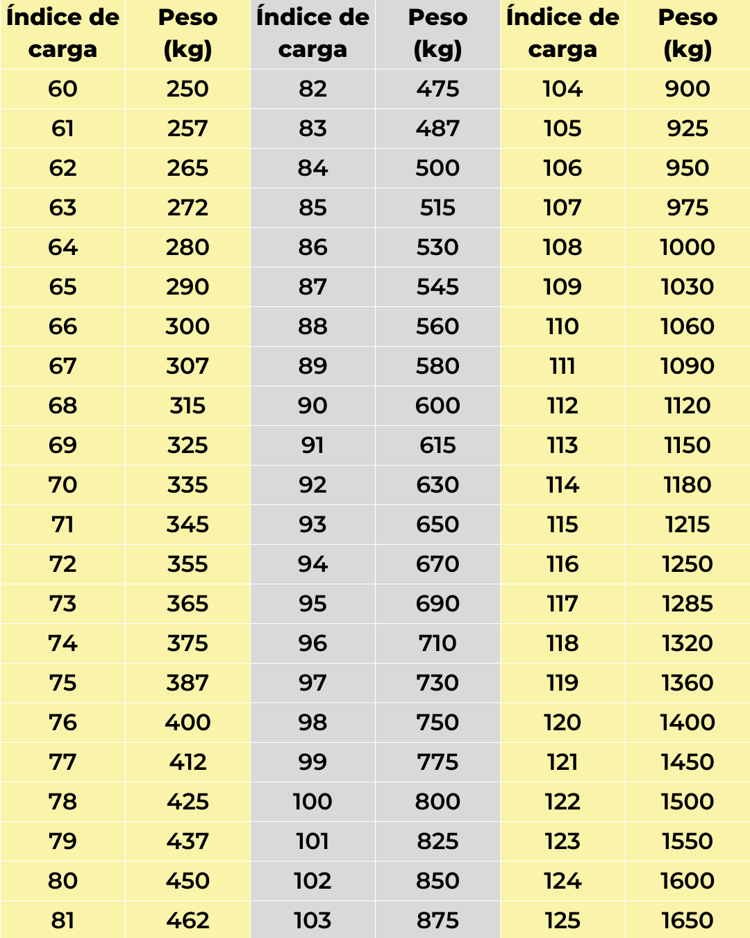 Tabla con el índice de carga para neumáticos