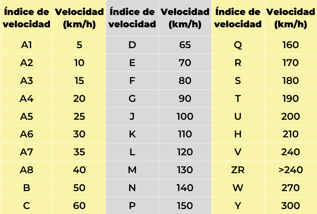 Como hemos comentado anteriormente, el índice de velocidad corresponde a la velocidad máxima que una rueda puede alcanzar. Para conocerlo, solo debes ver el flanco de uno de tus neumáticos y compararlo con esta tabla: